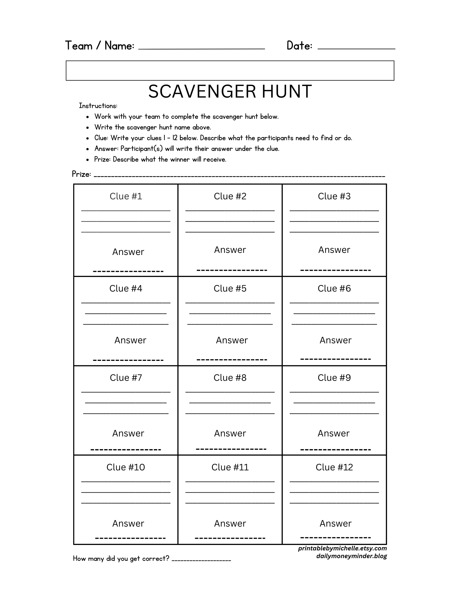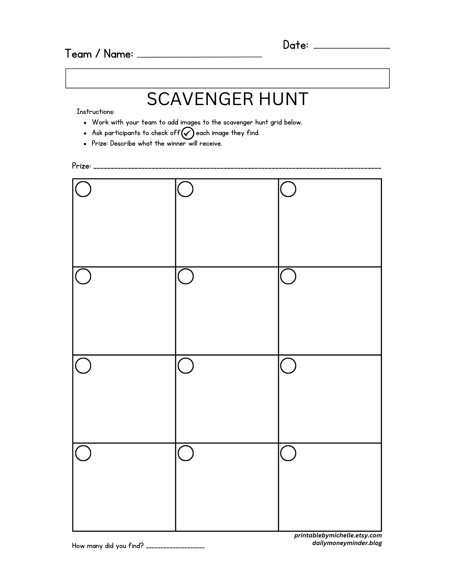 To make it easier to create your scavenger hunt, here are two simple printable templates you can use. Feel free to adjust it to fit your theme and the age of the participants.